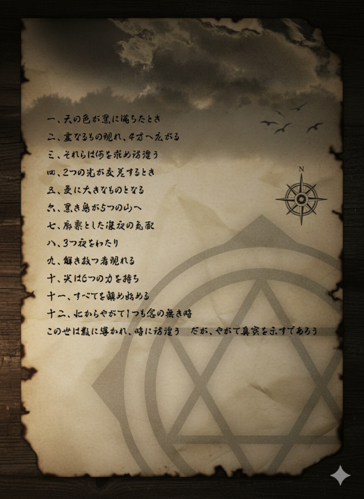 この「灯火」の一節は、単なるパズル解きのガイドではありません。ストーリーの根幹とプレイヤーの歩みを重ね合わせ、ラストバトルへと導くための「予言」として構成しました。