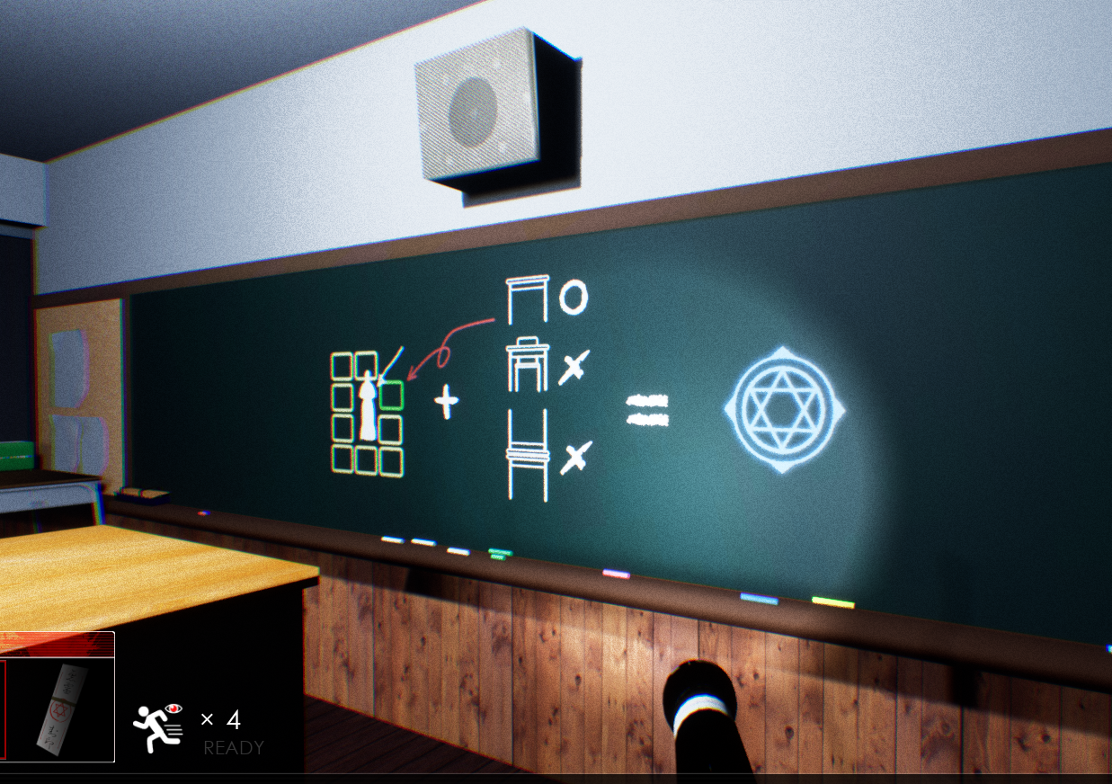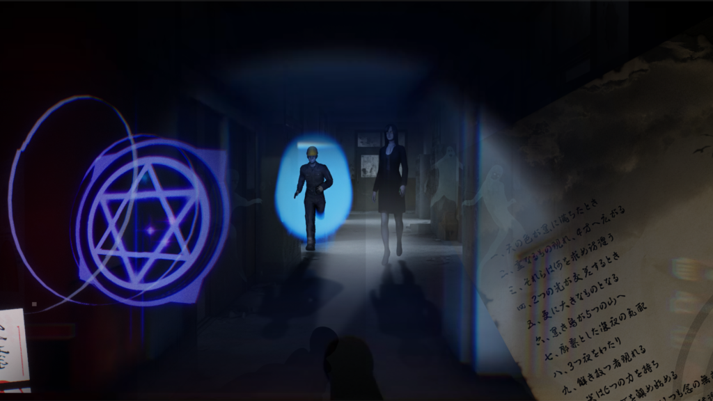 教室に現れる霊、廊下を徘徊する霊が存在します。主人公は霊を封じることはできても、戦う術を持っていません。見つかれば逃げるか隠れるしかありません。心拍数が上がる音、曲が流れたらすぐ行動してください。